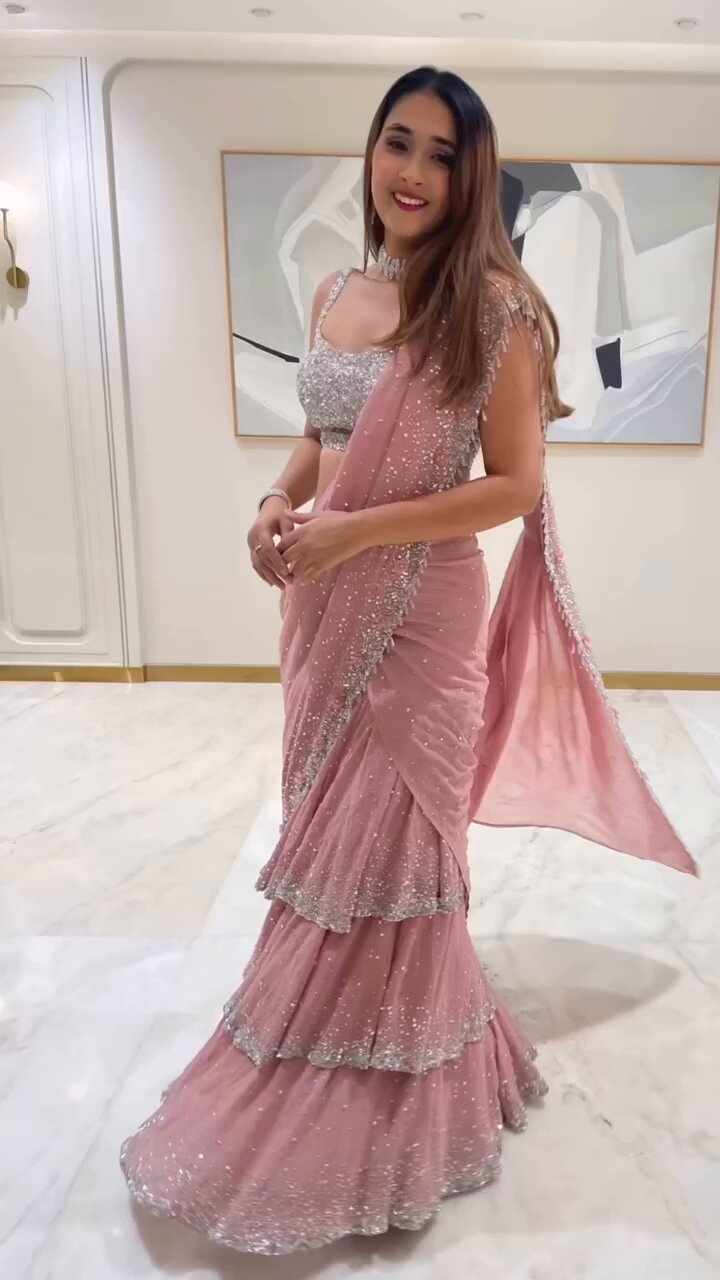 Noor Pink Ruffle Saree Tradition with Organza Flowers & Aari Work